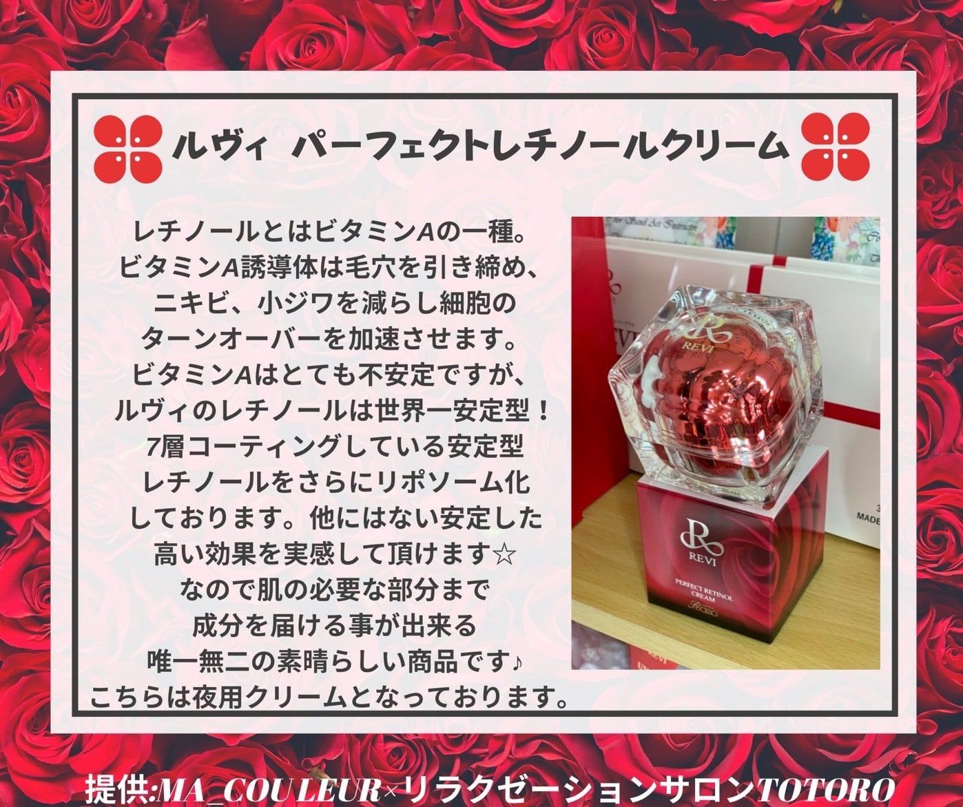 成分を安定させるのが難しいレチノールを7層でコーティングし尚且つリポソーム化し浸透も良くしたシワ、シミ、ニキビにも良いものとなっております!